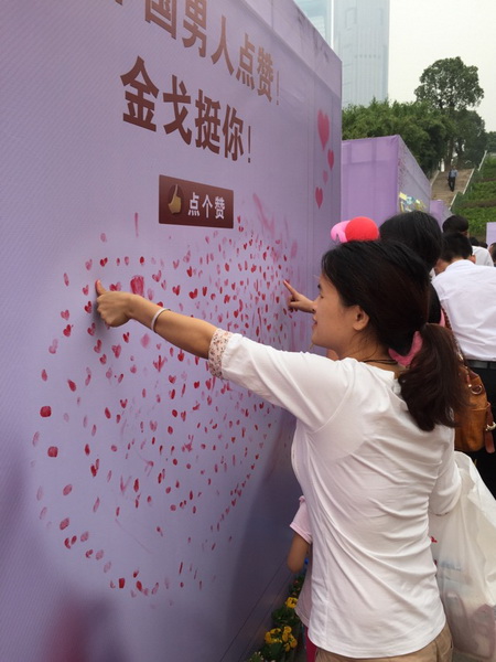 而线下活动现场,也充满了关怀男性的气氛。记者看到,此次不仅有与男性健康相关的科普知识展示,会场还设置了“减压区”和“点赞区”,让活动参与者充分互动,关爱男性健康的氛围异常热烈。不少情侣、夫妻纷纷在按下象征关爱的心形手印,表达对对方的爱。整个口号墙上,都点满了活动参加者的“赞”!据了解,每一位参与活动的人都可以获得“金戈健康锦囊”1个。觉得自己压力巨大的男性还可以在活动现场的减压区,向小美女索抱求减压,因此减压区也排起了长长的队伍。拥抱男性的女生表示:“拥抱一下虽然无法真正解决他们内心的压力,但至少可以表达出我们对他们的关爱和支持。”