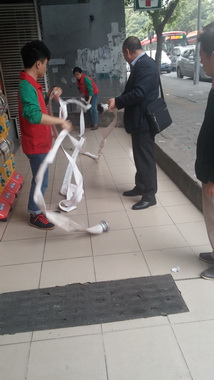 2月3日上午,检查小组首先对市区内的多宝路72、74号、多宝酒店、和平西路及芳村厂区等出租物业进行检查,特别对上次检查中指出的需要整改的问题进行了重点检查。在多宝酒店分租点老百姓药房,检查组发现其仓库的货架上有电线与货物混杂在一起,存在重大安全隐患,令其立刻现场整改同时对其店长及多宝酒店主管进行了严肃的教育。此后,检查组陆续发现多个消防安全隐患,都一一进行了登记并提出整改方案要求各租户及时整改。