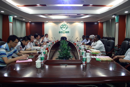 参观后,双方在第一会议室进行了友好和深入的交流合作。广药集团副总经理刘菊妍在会上介绍了广药集团发展简况、产品情况,总厂药研所博士刘毅介绍了总厂发展及科技创新情况。哈瓦•哈桑•穆哈默德部长对广药白云山众多产品产生了浓厚的兴趣,包括总厂抗生素、白云山金戈、王老吉凉茶、中一安宫牛黄丸等,并期望下一步在产品等方面加强合作,实现共赢。