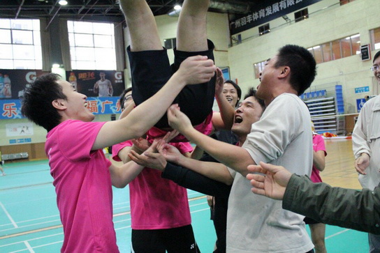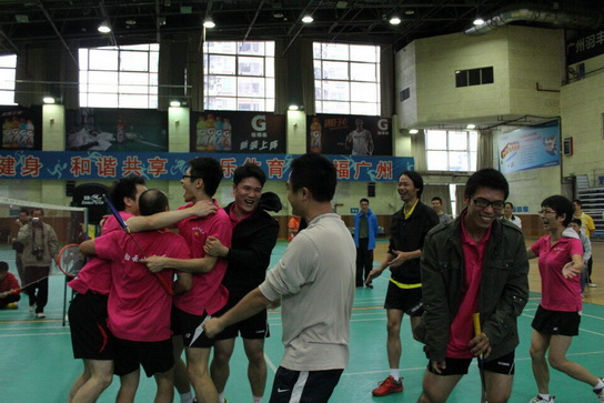决赛中,总厂又迎来了强劲的老对手—中一。中一队拥有广药数一数二的优秀女子选手,总厂要想胜出必须从男子项目中找突破口,然后以女子项目挑战中一,方有胜算。为此,总厂队的智囊团布下战术,派出8名大将进入决赛战场,队员们暗下决心,一定要战胜对手,赢得比赛。男单、女单、混双在预测中顺利进行,总厂以总分2:1领先,按照我们赛前布署,男双我们必须拿下,才能以总分3:1赢得比赛,如果打成2:2,随后的女双,我们胜算甚微。就在这时,男双比赛刚打2个球,我们的队员小卢脚扭了,场上气氛一阵骚动。如果小卢脚伤不能继续比赛,也就意味着我们拱手将比赛胜利送给中一。大家紧张地围在受伤的小卢旁边询问,小卢经过简单的脚伤处理后,忍着疼痛,眼神坚定的跟队友说:“没事,我可以。”随即上场继续坚持比赛。双方队员打得难分难解,比分一直交替上升,5平、6平……18平,大家屏住呼吸,绷着忐忑的心,在工会办公室郑华主任的带领下,为队友的每一个球加油鼓劲,有些观众都受不了现场紧张的气氛,躲得远远的,可眼神却时刻关注着场上的动态,第一局总厂男双终于以20:18险胜;第二局双方打得依然难分难解,比分从1平打到12平,总厂男双选手面对打法凌厉的对手沉着冷静,通过娴熟的技巧、激烈的扣杀、略胜一筹的防守,坚持到底,最终以15:12战胜了对手,也为队伍拿下致胜的1分,总厂以3:1的总分赢得比赛,成功获得本次羽毛球混合团体比赛的冠军!来之不易的胜利让总厂队员们冲向男双队员,将忍着脚的疼痛战胜到最后的小卢抬起来抛向空中,大家尽情享受着羽毛球带给我们的刺激与欢乐。