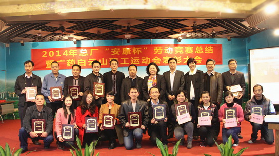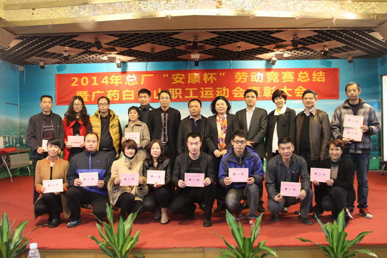 2014年12月26日,白云山制药总厂在办公大楼六楼会议室召开2014年总厂“安康杯”劳动竞赛暨职工运动会表彰大会。厂长朱少璇、党委书记周志魁、副厂长郑丽真、副厂长刘汉明、总工程师许春江等厂领导及获奖者、员工代表近120名出席了表彰大会,厂领导为获奖集体及个人颁奖。会议由纪委书记、工会主席许镇江主持。