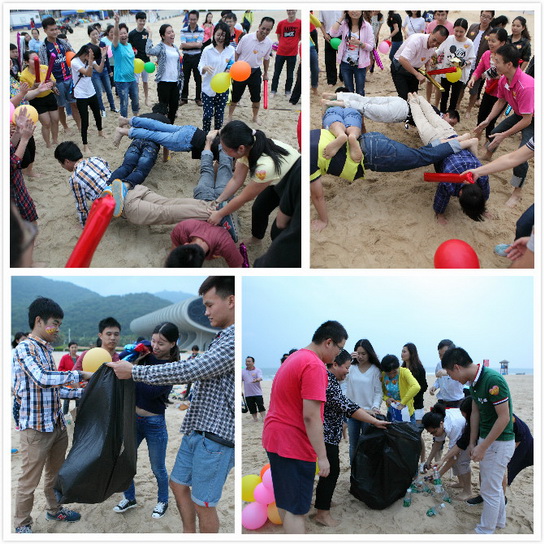 开展拓展培训时,我们将广大党团员分成8个小组,各个小组都有自己的队长和队名;培训项目有5个,都是考验团队的合作精神,包括袋鼠接力、带球接力、传呼啦圈等项目,每个队都发挥了极大的潜能,加油欢呼声此伏彼起,团队的力量在这一刻发挥得淋漓尽致。尤其是摆造型的两支队伍,为了完成任务,队员必须趴在沙地上,把双脚放在彼此的背上,两臂撑起,正确完成造型后地上就仅剩下四双手,然后做一个俯卧撑,最后保持造型平移到指定的位置……每一分每一秒都在考验团队协调与默契。面对如此艰难的任务,队员、队长、拉拉队各司其职,呐喊声、欢呼声响彻天边,高潮一浪接一浪,屡败屡试,屡试屡败,直至成功响起雷鸣般的掌声。