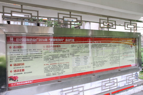 金秋9月,秋风送爽。白云山制药总厂大院内处处都能感受到质量教育的气息:在职工食堂的主要通道宣传栏张贴的《2016年“质量教育月”活动方案》,内容具体,思路清晰,切实可行;厂区主干道挂着“信誉来源于品质、品质来源于素质”,“适应经济新常态、实现质量新跨越”,“责任是质量的保证、质量是品牌的生命”,“弘扬工匠精神、勇攀质量高峰” 四条宣传横幅,横幅格外鲜亮、注目。