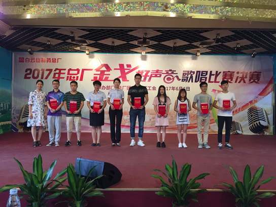 6月6日下午,总厂团委与工会联合举办了“唱响主旋律,凝聚正能量”2017年白云山制药总厂“金戈好声音”歌唱比赛。总厂厂长朱少璇、纪委书记周志魁、副厂长刘汉明、工会主席兼纪委副书记蔡淑君应邀出席了本次活动。本次比赛还邀请了郑华女士等5名专业声乐老师作为评委。比赛场面热闹,各选手轮番上场,各显神通,气氛热烈,亮点不断,给观众带来了一场视听盛宴。在所有队伍演唱完毕后,朱少璇厂长为大家带来了一首《今夜无眠》,将现场气氛推向高潮。经过了激烈的角逐,最后,来自第三团支部的王东豪、第二团支部的吴浩伟、第五团支部的“研发未来队”、第一团支部的“梦之队”和吴佩儒获得了“金戈奖”,曹凯鹏等19支队伍获得“好声音奖”。第一团支部、第二团支部以及第五团支部获得最佳组织奖。