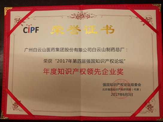 2017年6月3日,“2017第四届强国知识产权论坛”在北京盛大召开,白云山总厂获得“年度知识产权领先企业”荣誉称号。总厂法务总监许淑文代表企业参会并领奖。