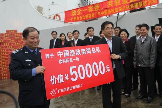 2012年11月21日,广药集团广州白云山制药总厂与中国渔政南海总队在中国渔政南海总队310渔政船上,共同开展了以“政企一家亲,共叙爱国情”为主题的共建联谊活动。中国南海区渔政局副局长郭富锦、副巡视员(总队长)朱英荣、广药集团副总经理、白云山总厂厂长陈矛,白云山总厂党委书记周志魁等领导以及双方单位干部及员工约130人参加了本次活动。