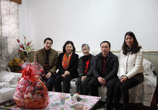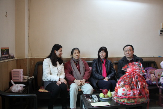 2016年1月21日,总厂副厂长郑丽真(右二)、工会主席(右一)慰问退休职工张霖和(左二)