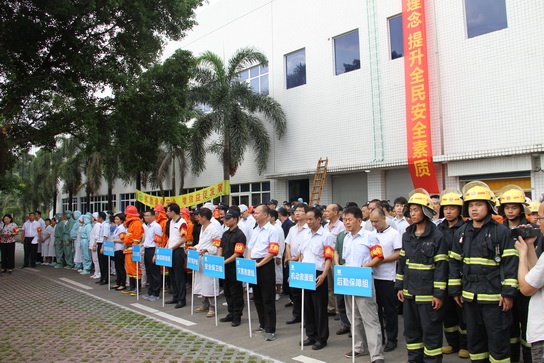 为做好消防安全宣传教育,提高员工消防安全知识水平,检验总厂应急响应人员对应急预案、执行程序的了解程度和实际操作技能,提高总厂应对突发事件的组织指挥、处置协调能力。由广药集团主办、白云山制药总厂承办的“2016年广州医药集团有限公司消防综合应急演练”活动,于6月20日下午在白云山制药总厂举行。市安监局李增华副巡视员、市安监局应急救援指挥中心副主任谢少敏、白云区消防大队教导员杜晓辉、副大队长李剑锋、白云区公安分局防火大队队长陈庆洪、同和派出所副所长郑央光、同和消防中队等领导,以及广药白云山吴长海副总经理,广药集团质量副总监、生产发展部部长赖志坚、广药集团保卫部部长欧阳强、副部长陈基金,白云山制药总厂厂长朱少璇、党委书记周志魁、副厂长刘汉明、纪委书记、工会主席许镇江、总工程师许春江,以及总厂300多位员工参加了本次演练。广药集团属下各企业安全责任人和安全、保卫部门负责人前来观看本次演练。本次演练由广药白云山副总经理吴长海担任总指挥,白云山制药总厂厂长朱少璇任现场总指挥。
